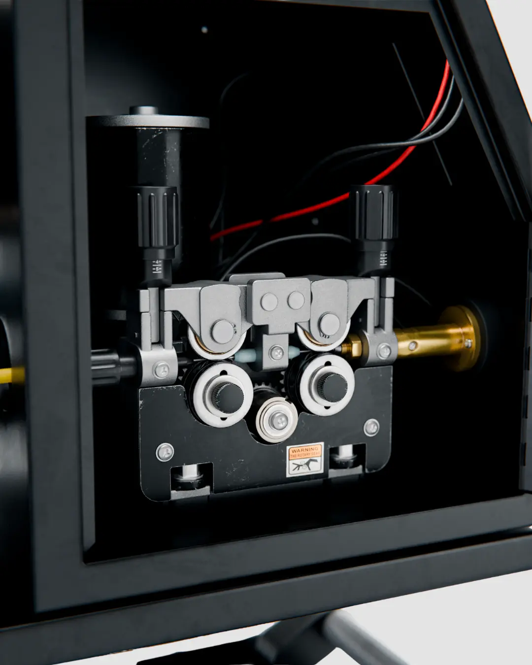 Entre sus diferenciales se encuentra la alimentación estable del alambre, que reduce las salpicaduras, permite una penetración profunda y genera cordones limpios. Es compatible con alambres de 0.8 a 1.6 mm y admite bobinas de hasta 15 kg. Cuenta con múltiples modos de transferencia (cortocircuito, globular, spray, pulso simple y pulso doble), además de inductancia electrónica ajustable para un mayor control del arco.